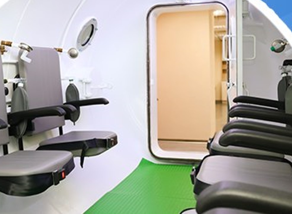 高壓氧治療是將病人置於高壓艙內,並將艙內氣壓提升至一點四個大氣壓以上,讓病患吸入百分之百的氧氣,以提高血中含氧濃度,改善組織缺氧及促進傷口癒合,並增強白血球之殺菌能力,以達到各方面治療效果。