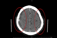 陳男經電腦斷層檢查後,發現腦部雙側硬膜下血腫(紅圈