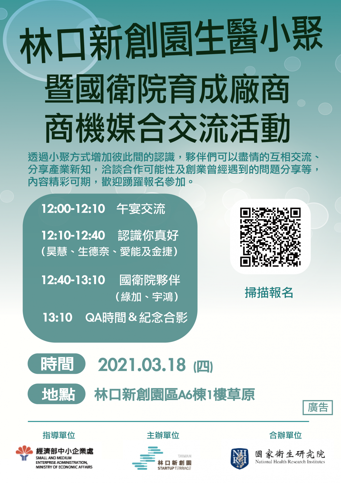 林口新創園目前已進駐業者約150家,園區擬定期舉辦各產業小聚,讓園區業者透過小聚方式增加彼此間的認識,夥伴們可以盡情的互相交流、分享產業新知,洽談合作可能性及創業曾經遇到的問題分享等,邀請屬於生技醫療領域的夥伴們參加。